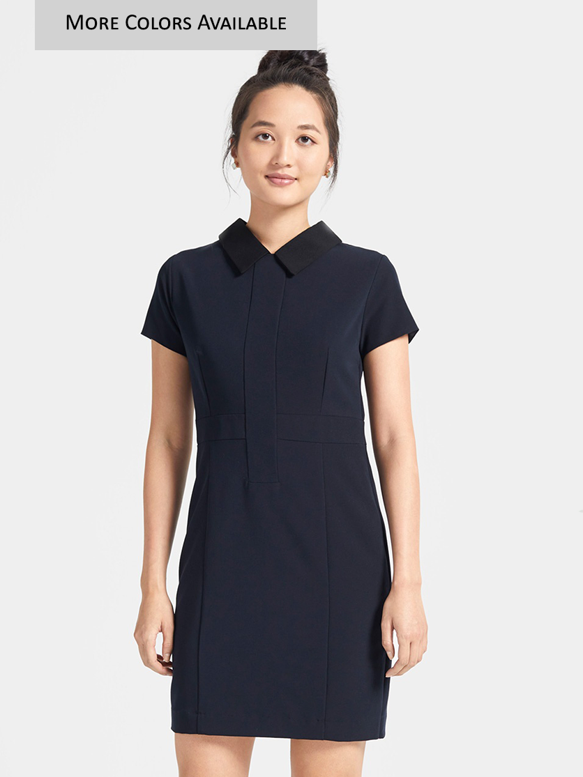 Inspired by Victoria herself, this curve-hugging silhouette flatters in all the right places thanks to strategically placed seams and our L2 stretch fabric. A crew neckline with a contrast collar give the Beckham its true identity. Subtle cap sleeves and a slit in the skirt makes dashing from meeting to meeting a breeze.