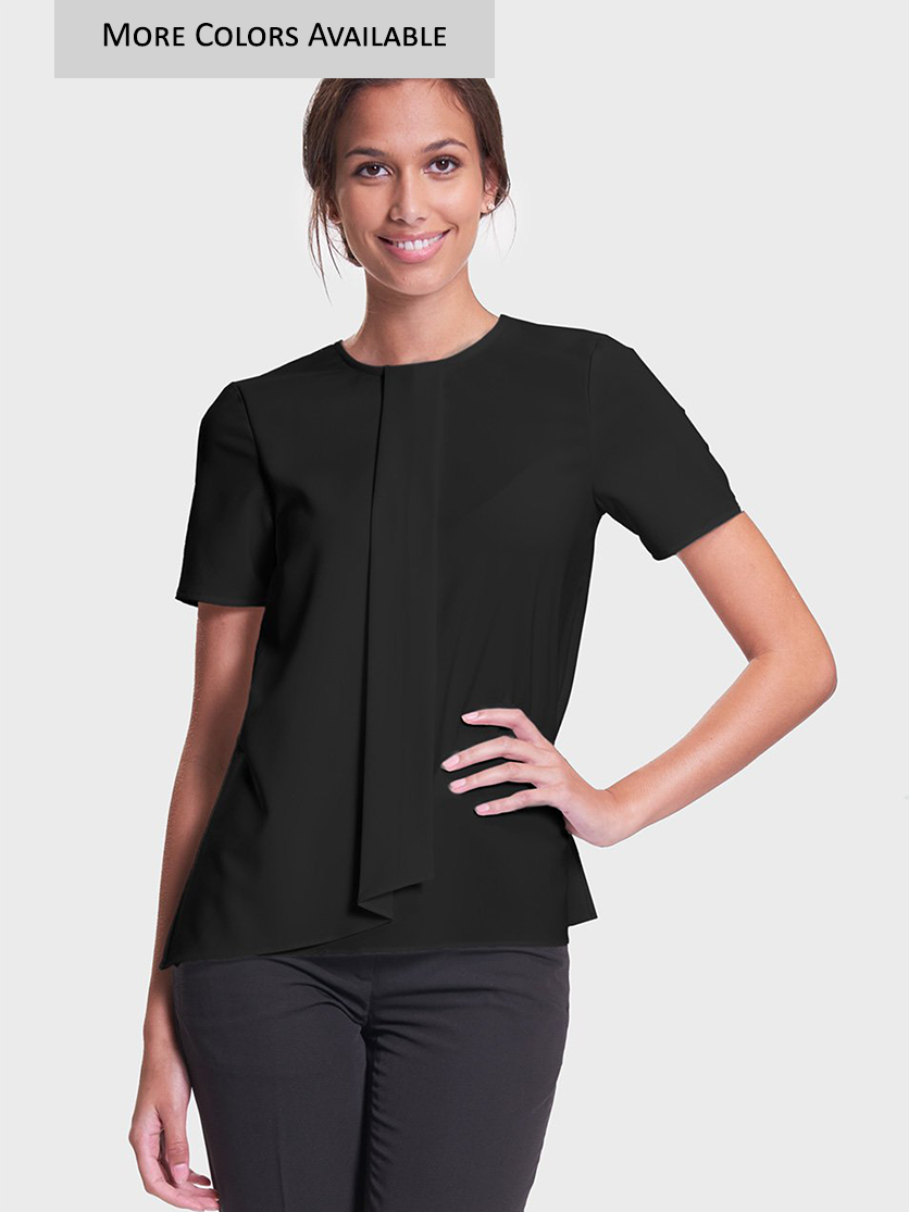 Easy breezy. This blouse is destined to become your favorite. With an elongating panel that cascades down the front, vertical lines and a roomy fit, it is the perfect complement to a blazer or cardigan.
