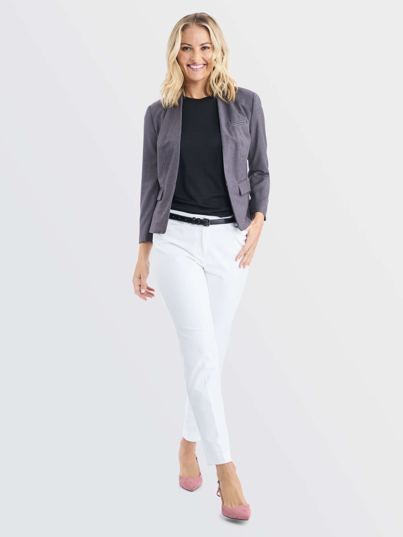 This hip-length jacket adds a professional yet laid back feel to any outfit. Sleek and slim-fitting with a collarless lapel, hidden hook and eye closure, and 3/4 sleeves.