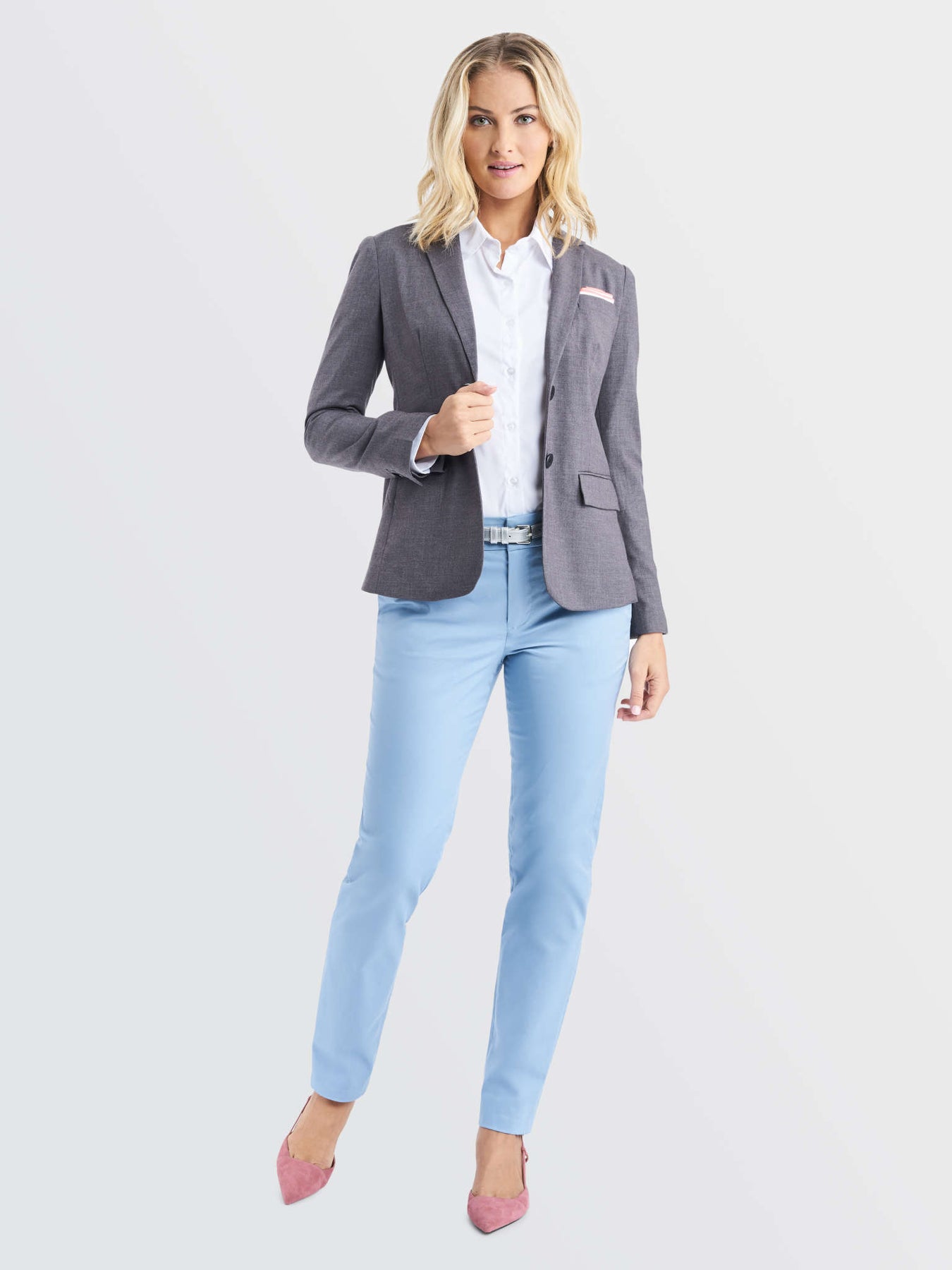 The polished final layer of any look, this blazer is tailored with expert craftsmanship for an impeccable fit. Accented with a breast pocket that can be styled with a feminine pocket square and working buttons at cuff for a rolled sleeve look exposing pinstripe lining.